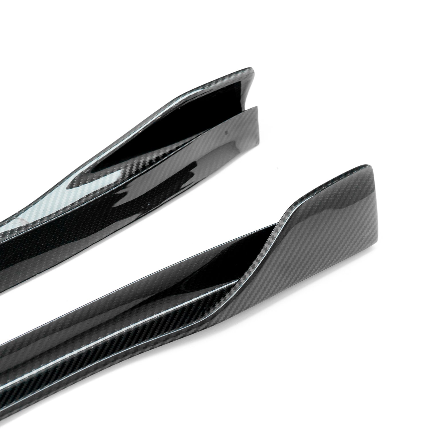 MHC+ Tesla Model 3 Side Skirts In Pre Preg Carbon Fibre. These stunning dry carbon fibre side skirts give the Tesla Model 3 a much more aggressive and imposing look. It also gives the illusion of a lower, wider stance, which perfectly matches the Model 3's sleek and futuristic aesthetic.