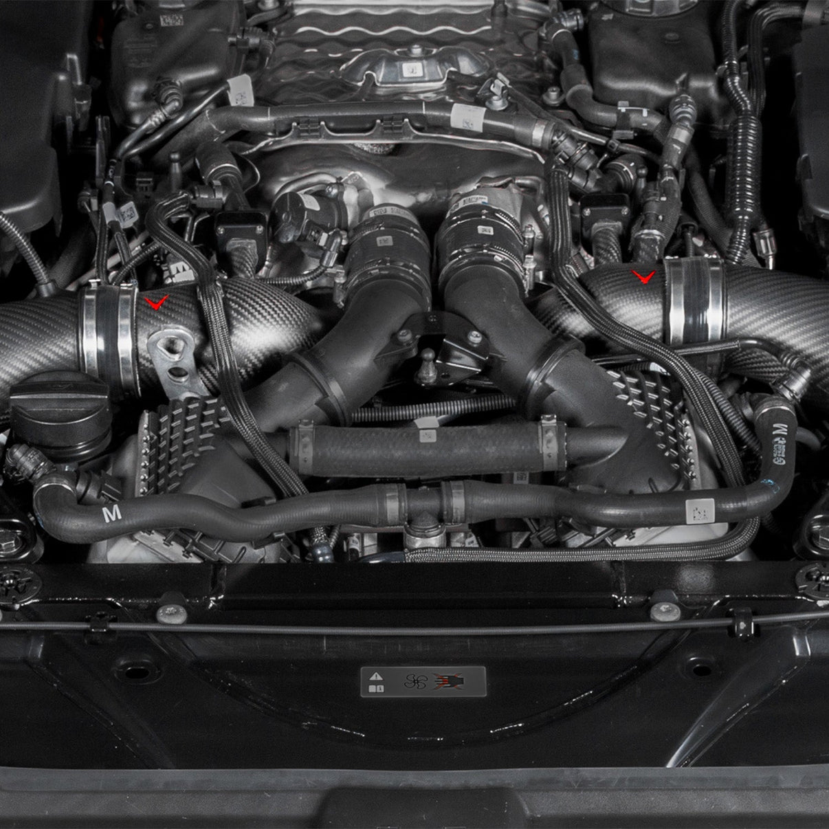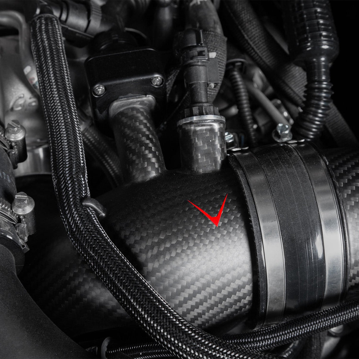 Constructed from high-temperature-resistant prepreg carbon fibre, each inlet is reinforced with CNC-machined turbo flanges and a precision breather valve assembly, ensuring excellent fitment, durability and heat resistance. The internal geometry has been optimised for low flow resistance and minimal turbulence, allowing the turbos to spool faster and more efficiently.