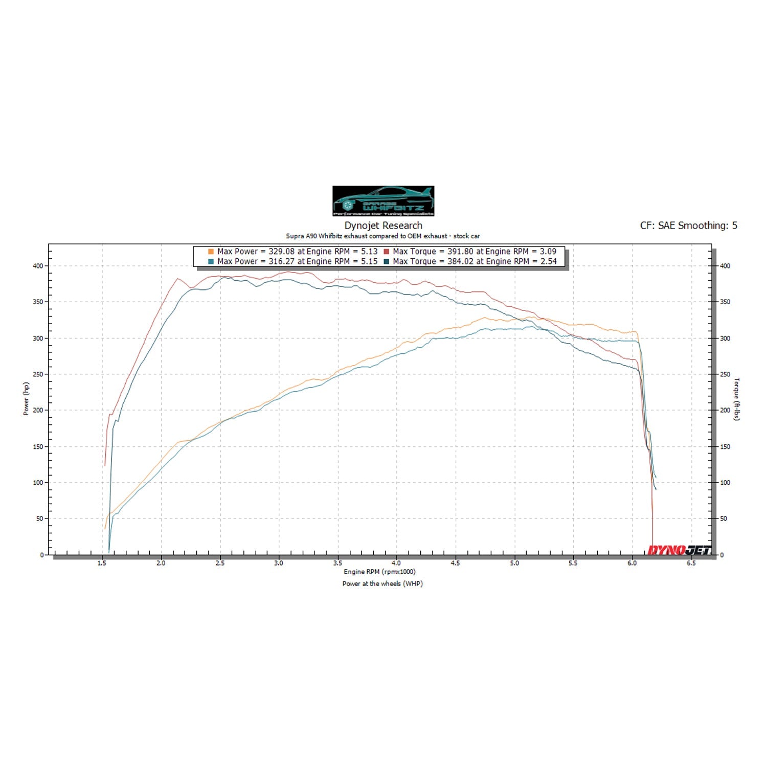 The Garage Whifbits titanium exhaust system for the Supra is a full cat-back, meaning it removes the restrictive OPF. The system is much more free-flowing which allows for a noticeable power gain and increased tuning potential. Dyno tests revealed a +15hp & +40 lb/ft increase over standard. Even greater power gains can be made on higher horsepower cars where the stock exhaust will become even more restrictive.