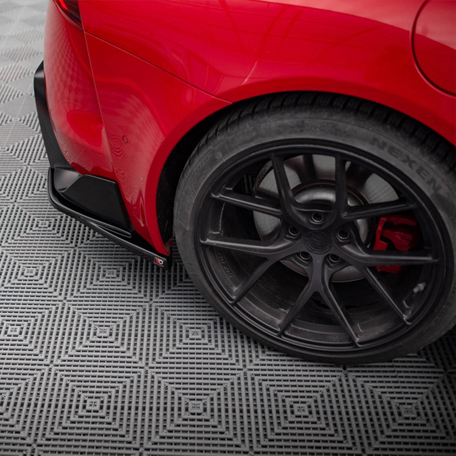 Maxton Design's Toyota A90 Supra V3 Gloss Black Rear Side Splitters add a lower and wider look to the vehicle's rear end for a 'squatted' stance.