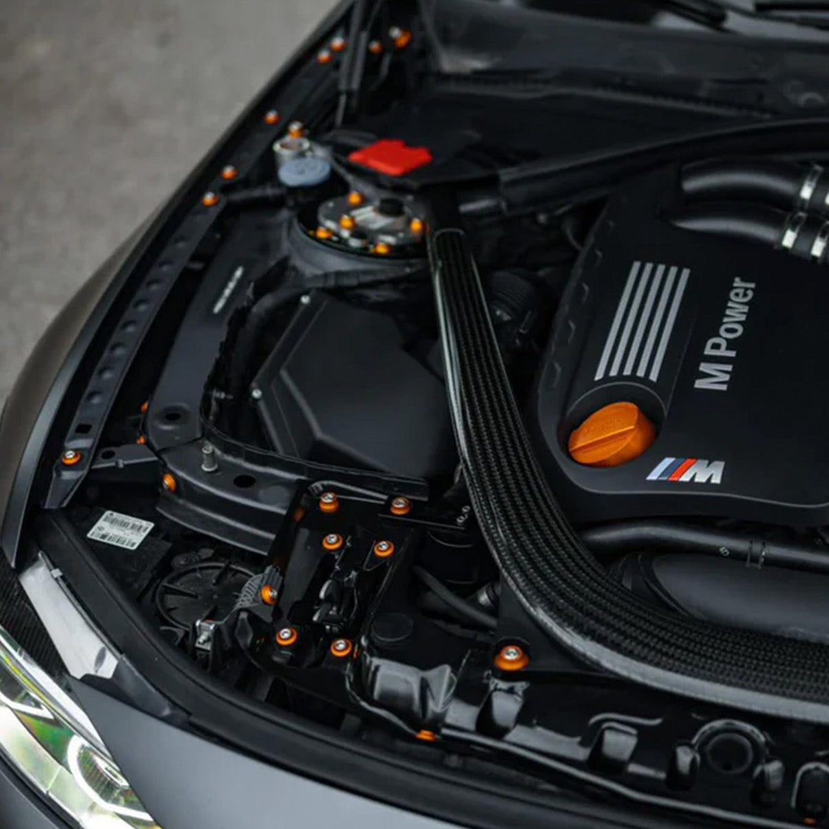Downstar Inc BMW S55 billet engine dress-up kit for the BMW F80 M3, F82 M4 and F87 M2 Competition is made up of 44 pieces that replace the OEM hardware. The kit features a series of Billet beauty washers and stainless steel nuts & socket head bolts that transform the look of your engine bay.