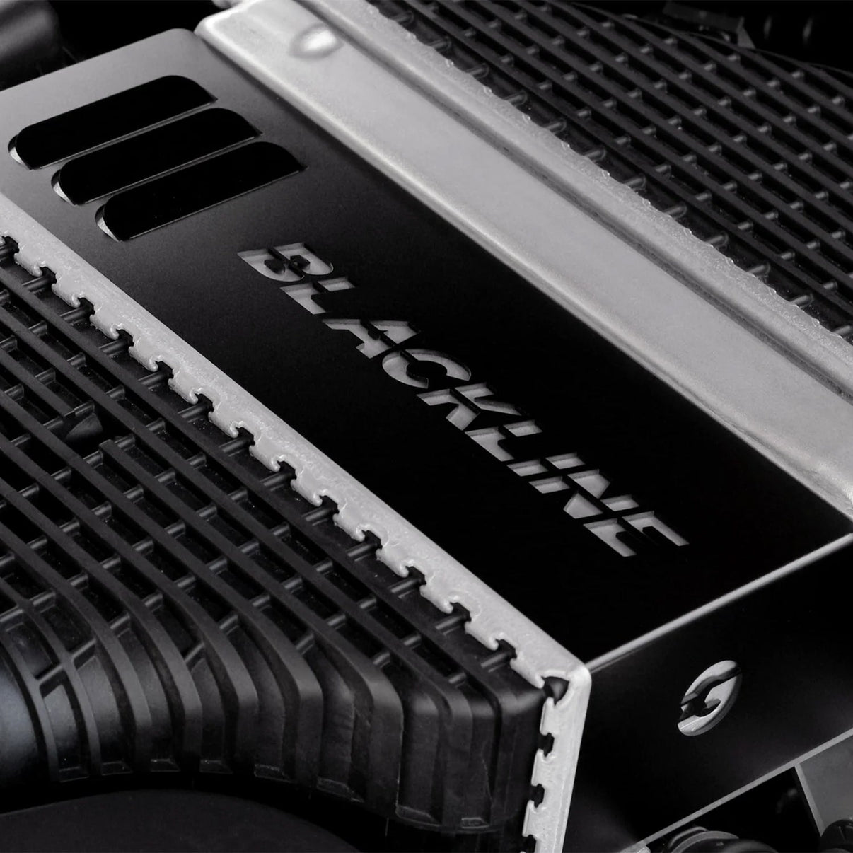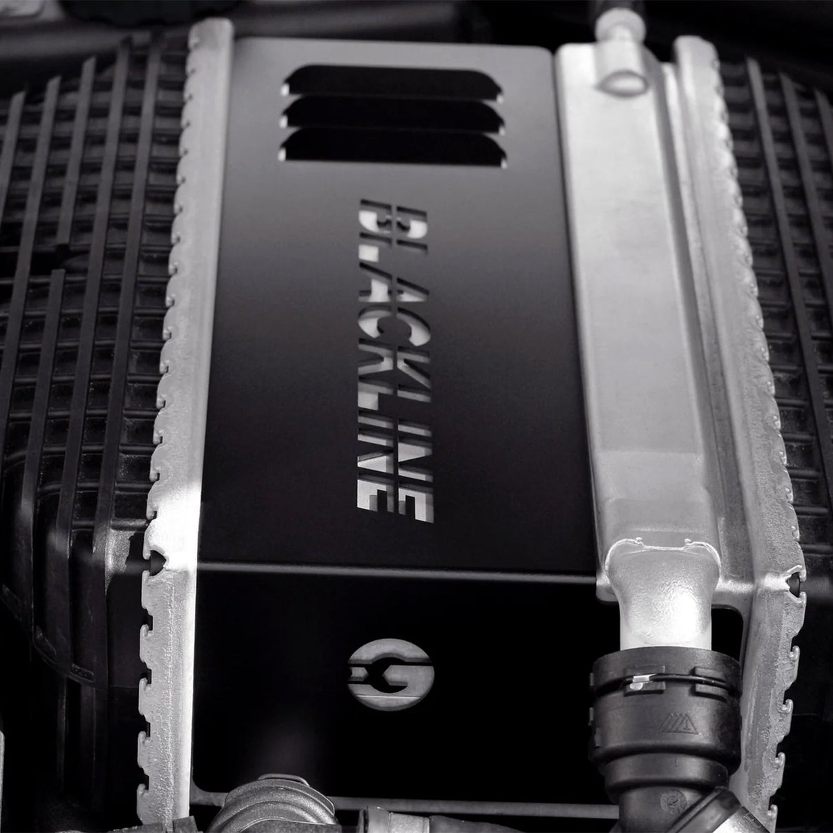 GoldenWrench Supply BLACKLINE Performance Charge Cooler Cover for the BMW F80 M3, F82 M4 & F87 M2 Competition - an elegant solution to cleaning up the factory cooler unit in your engine bay. Constructed from 1.5mm thick T5 aluminium, featuring a Tri-Fin design and laser cut BLACKLINE logo and classic G insignia giving the factory unit an improved visual appearance. Each cover is finished in a sleek satin black anodized finish.