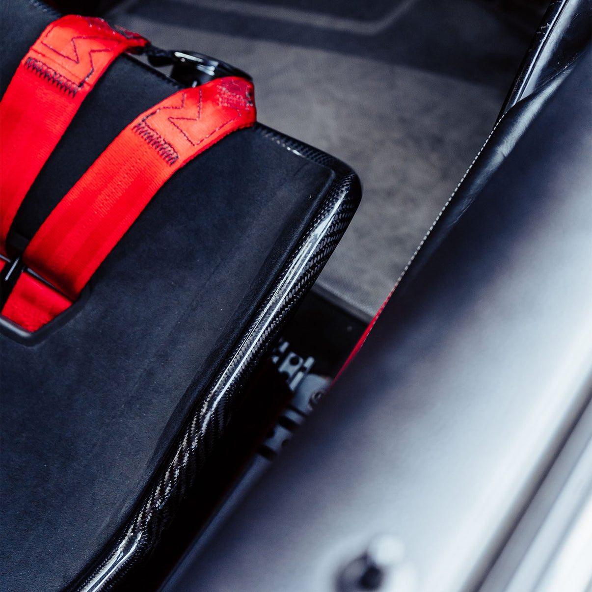 The B10 has been given a modern fresh look and although its highly technical laminate is rigid and tough, it weighs only 4.5 kg. The seat comes complete with a Dinamica® suede covered headrest pad. The optional suede covered cushion and back panels add 1 kg and are recommended when the car is intended for mainly road use.