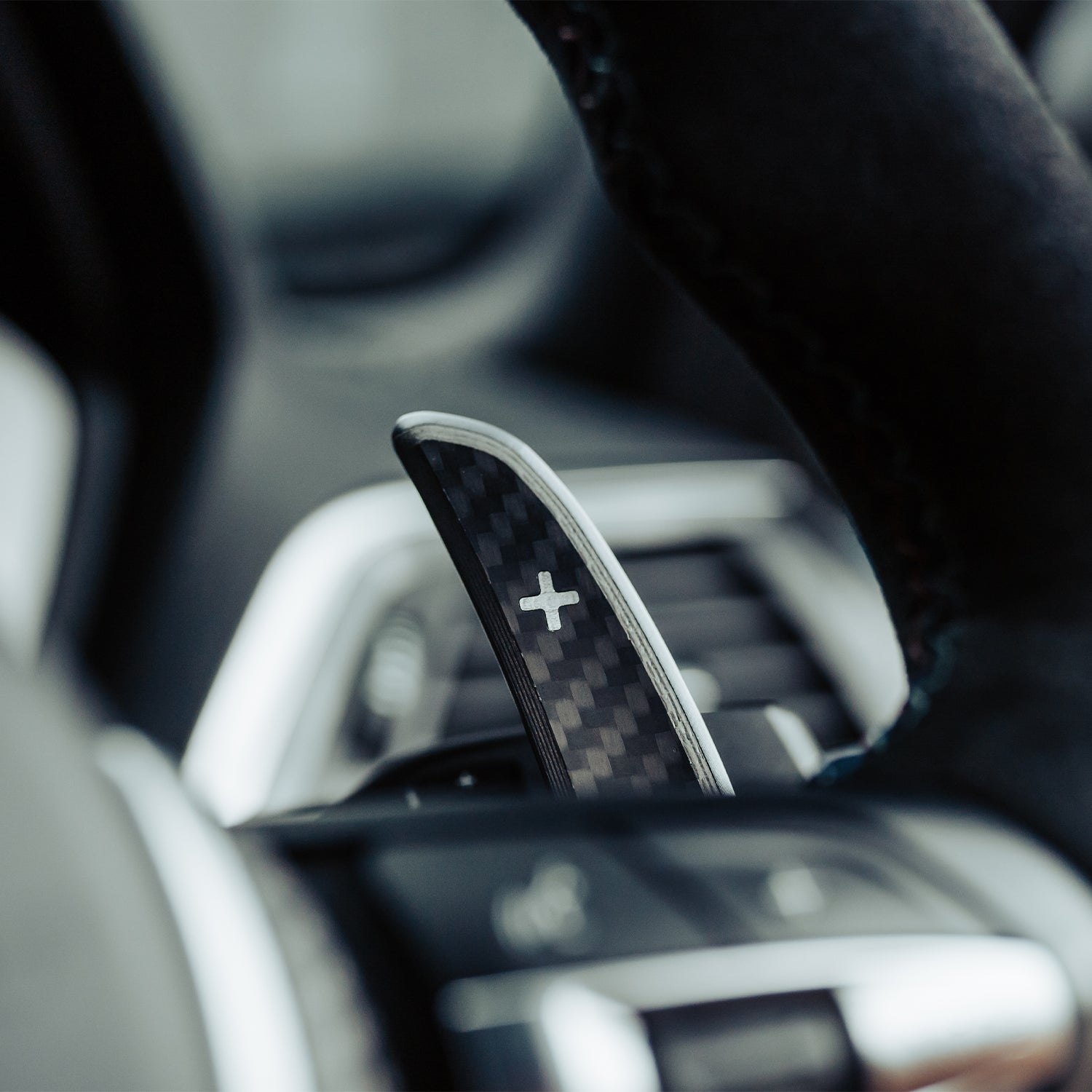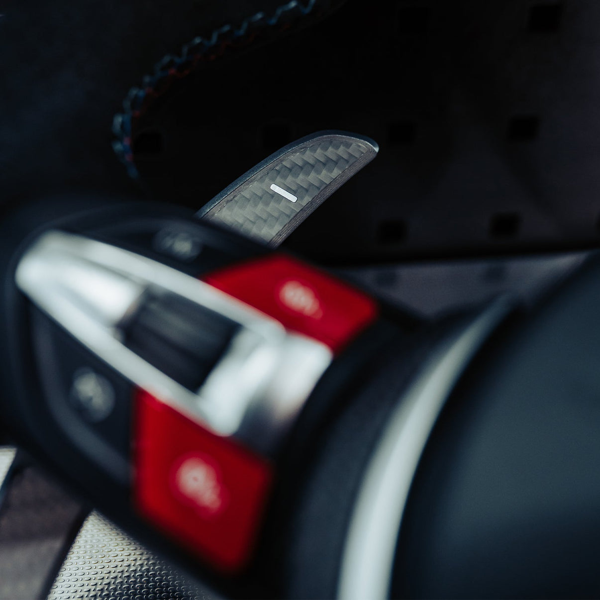 JQ Werks has introduced a brand new style featuring a carbon fibre inlay on a gunmetal anodised CNC-machined billet aluminium paddle - replacing the full carbon fibre paddle. The addition of billet aluminium gives the paddle a more weighted feel for a more engaging gearshift, whilst maintaining the premium carbon fibre look. The full CNC-machined silver anodised billet aluminium paddles are still available as an option if carbon fibre isn't your style.