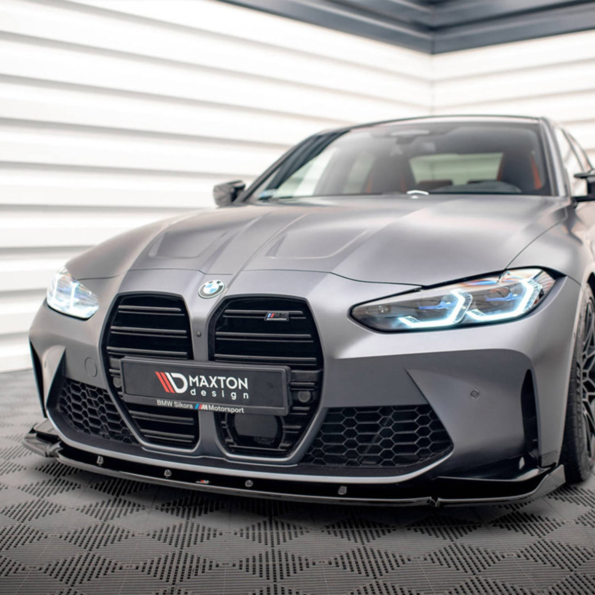 Maxton Design's BMW G80 M3 G82 M4 V3 Gloss Black Front Splitter adds a lower and more imposing look to the vehicle's front end. Featuring aggressive slats and integrated side slitters, this front splitter gives the vehicle greater road presence and increased aggression.