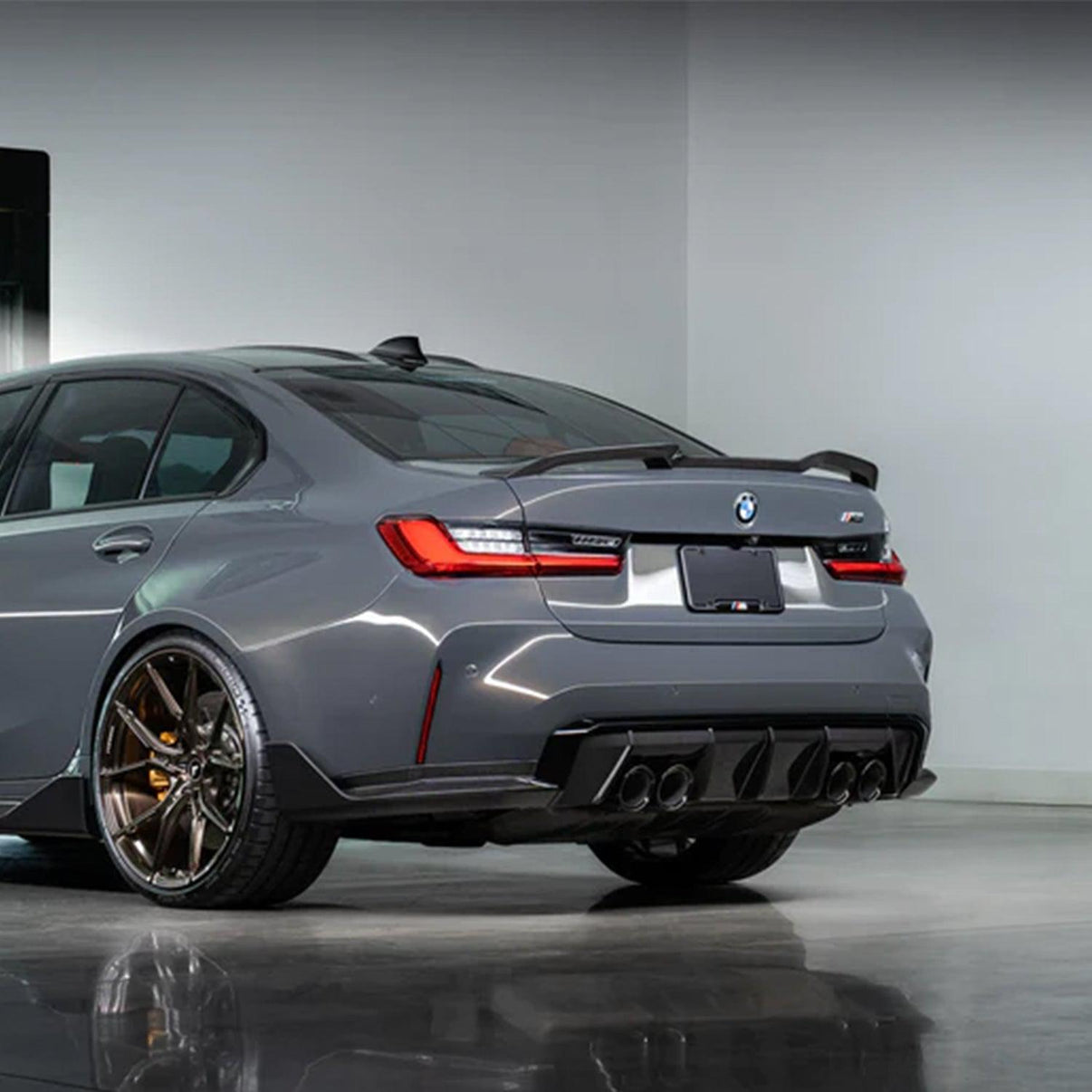 Vorsteiner BMW M3 Aero Rear Spoiler in Preg Carbon Fibre is an incredibly aggressive exterior styling option for the G80 M3. Featuring aggressive wings elevated above the boot lid, the road presence created by this spoiler is undeniable.