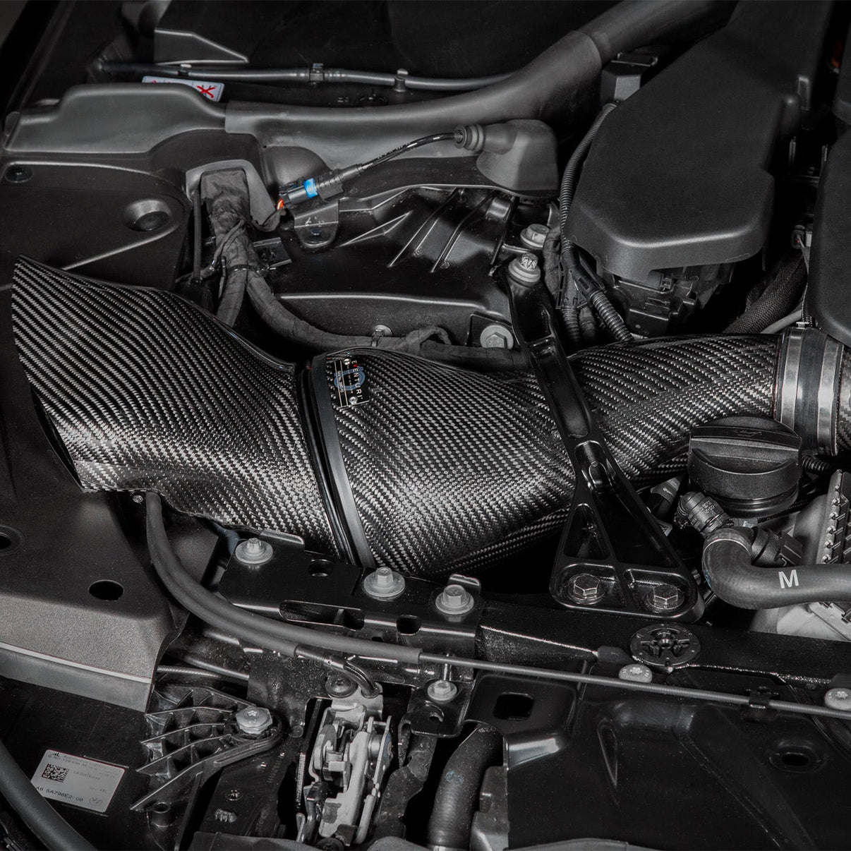 Unlike conventional intakes that often compromise flow efficiency or thermal management, the Eventuri system is developed from the ground up to ensure a smooth, laminar airflow path into the turbo inlets while keeping intake air temperatures consistently low. The dual carbon fibre ducts not only retain the OEM cold air feeds but also introduce a secondary air path from behind the front bumper grille, ensuring a greater volume of cool, dense air reaches the engine at all times. This design translates to reduced wastegate duty cycles and quicker spool-up, enabling the turbos to build boost more rapidly and efficiently.