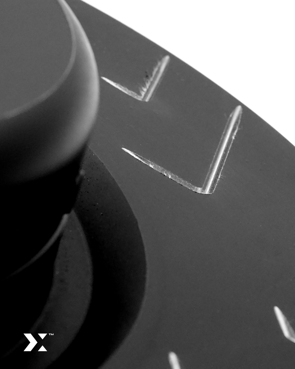 Featuring MMX’s signature directional groove design, the discs improve braking bite, clear debris more effectively, and reduce vibration distortion under high temperatures. Unlike drilled discs, this groove pattern avoids fatigue cracking while also generating less noise than traditional straight or curved groove designs.
