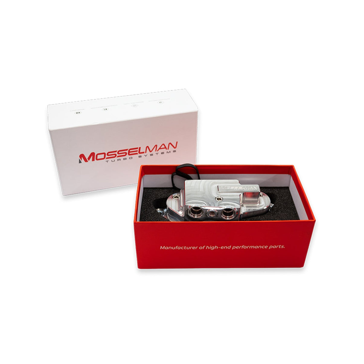 The Thermostat is plug-and-play and made out of a solid block of high-grade aluminium at Mosselman's facility. It is equipped with a real thermostat, not an always open solution. The oil will still reach the operating temperature at the same time as a stock thermostat.