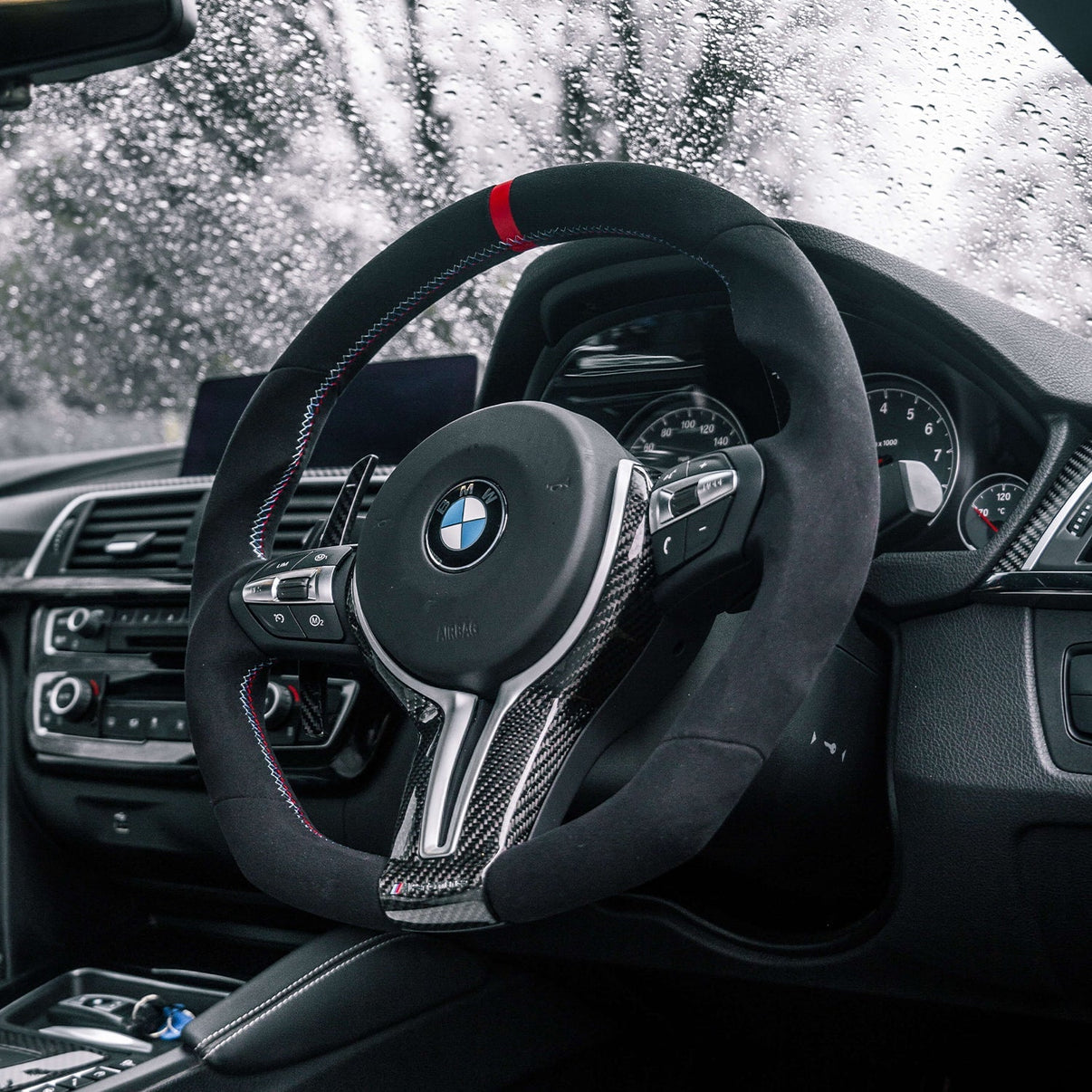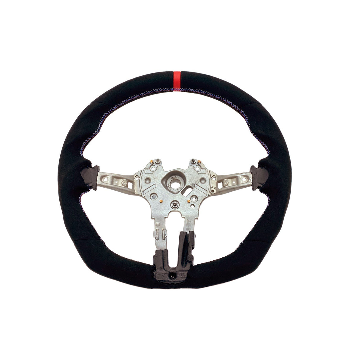 - Finished in durable Alcantara - Flat bottom design - Moulded grips - Red 12 o'clock centre stripe at the top of the wheel - BMW tri-colour stitching You will need to fit all parts including the airbag, and steering wheel controls and insert off your OEM wheel. Alternatively, get in touch for professional fitment. - All parts off of the OEM wheel fit onto this custom wheel