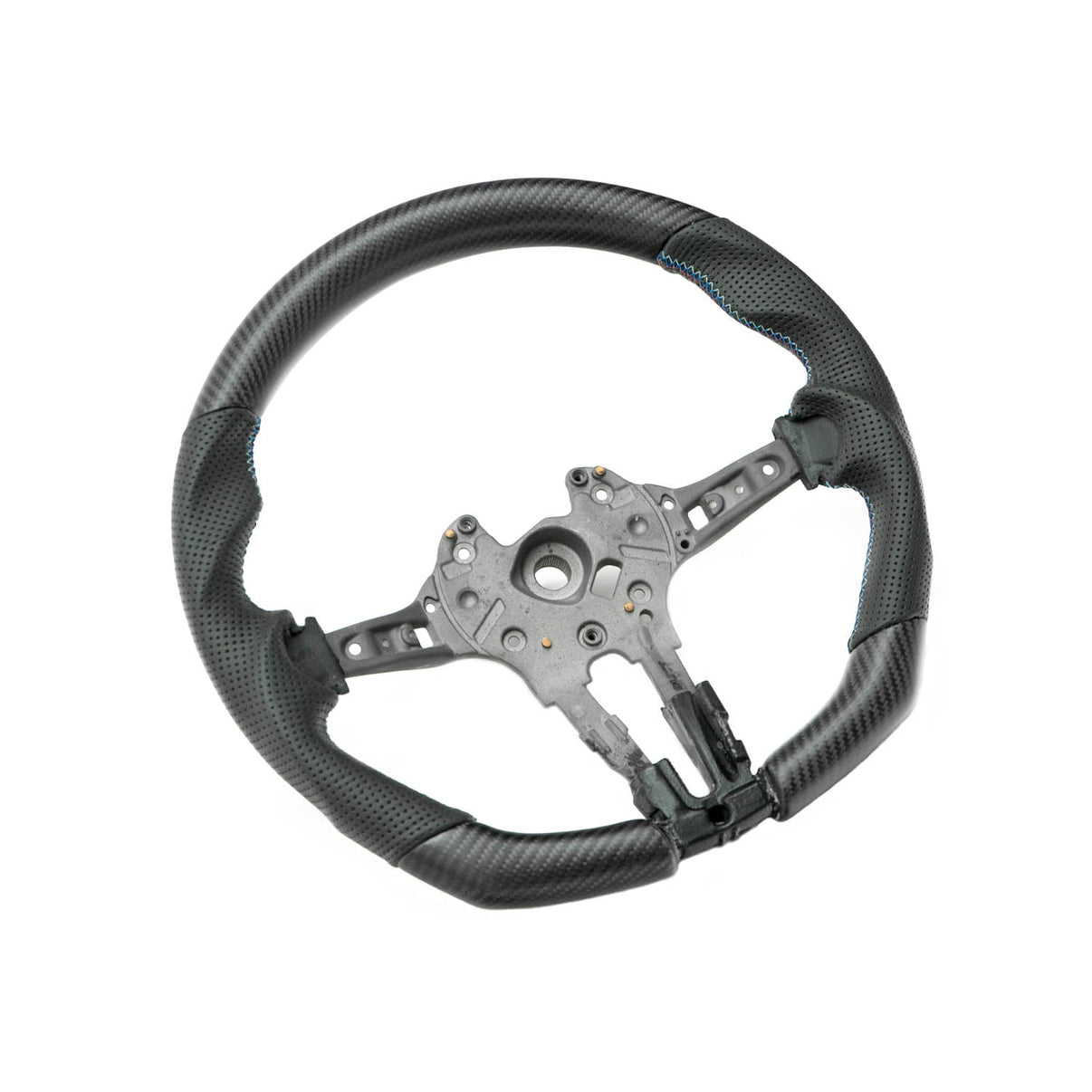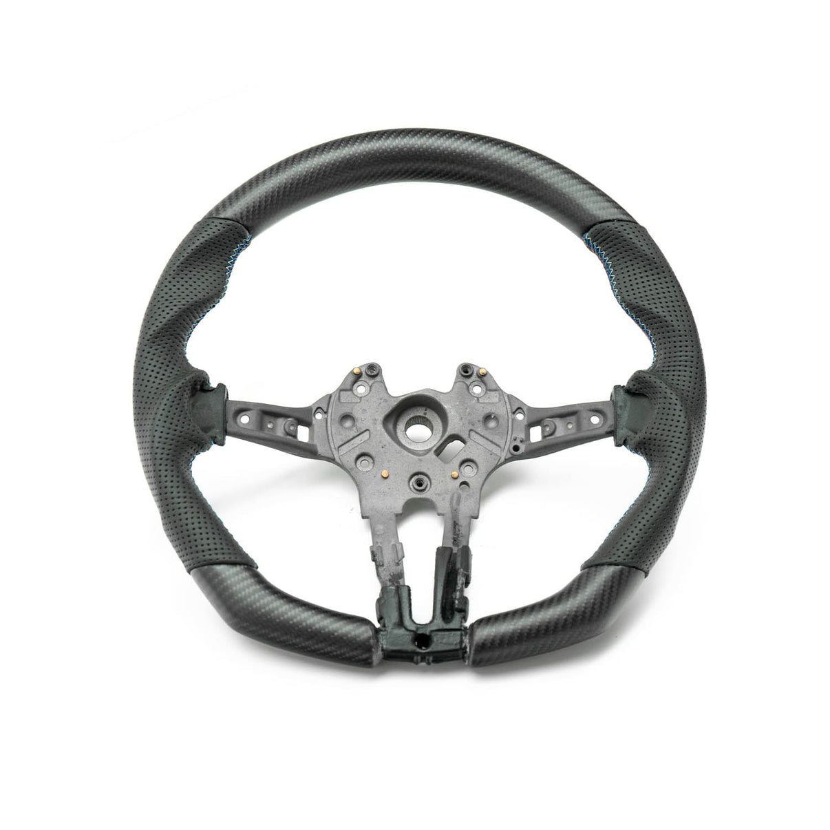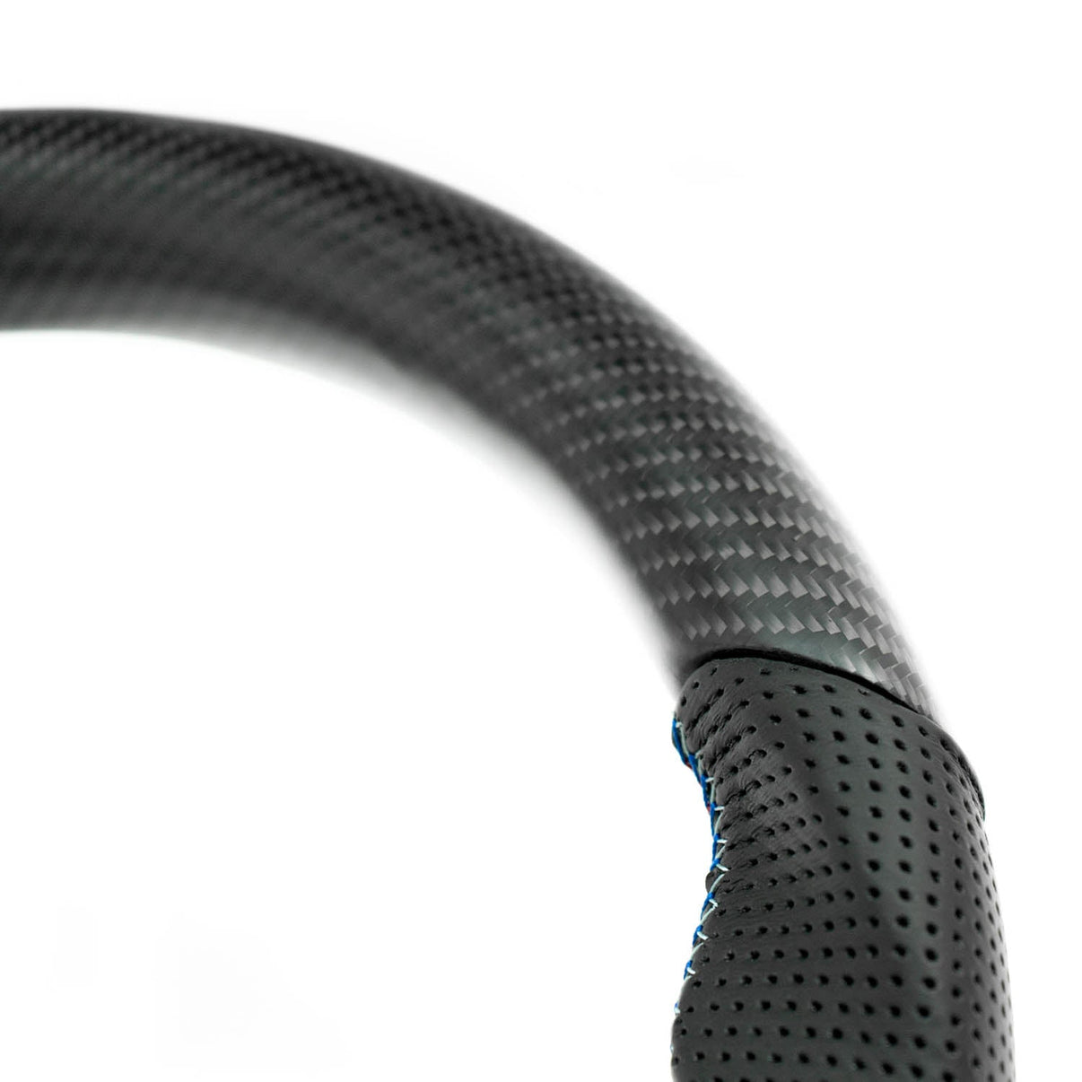 SHFT BMW F Series Flat Bottom Steering Wheel In Matte Carbon & Perforated Leather is a subtle OEM+ steering wheel designed to give your interior a much more premium feel. The matte carbon signifies performance and the perforated leather adds an element of luxury. The wheel also features BMW's iconic tri-colour M stitching.