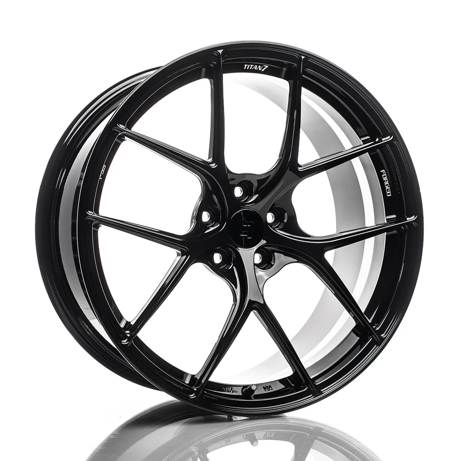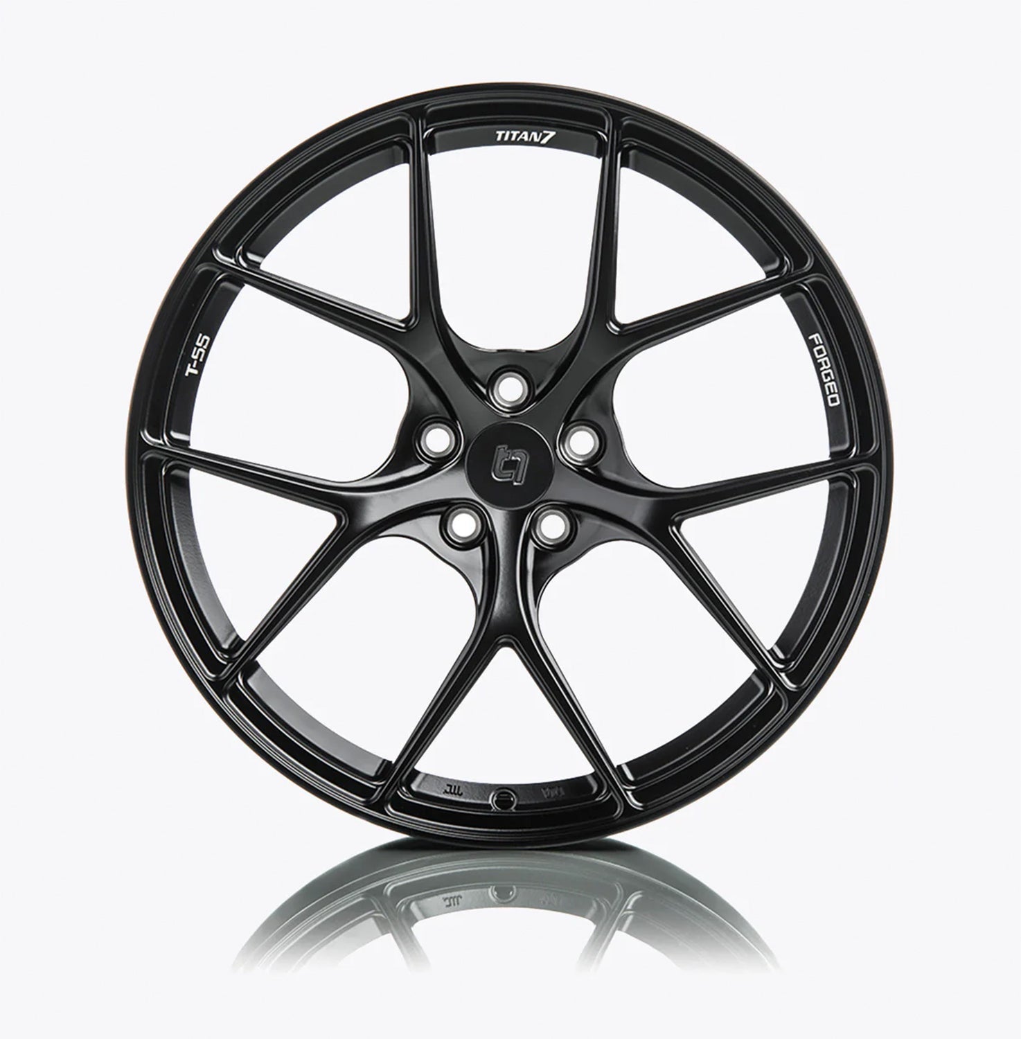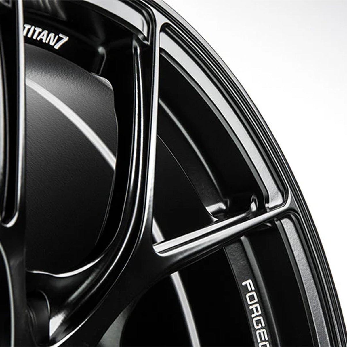 TITAN 7 T-S5 is a fully forged wheel designed completely with performance in mind. Pressurized with 10,000 TONS of industry-leading pressure to give you a wheel that is incredibly strong while giving you all of the performance attributes you need in a track-focused wheel. Upon close inspection, you will notice strength-adding ridges which have been strategically placed to give the wheel rigidity while keeping weight to a minimum. The split 5-spoke design was chosen for its motorsports heritage and track-worthy structure. Each wheel from Titan 7 features traction-improving bead seat knurling, beefed-up inner rim flange for durability and strength, and logo machined accents. The T-S5 is designed for each application to clear all popular aftermarket big brake kits while achieving maximum concavity. All wheels are durability tested according to JWL standards to ensure safety while you perform. Authentic performance from Titan 7. Forged for All.