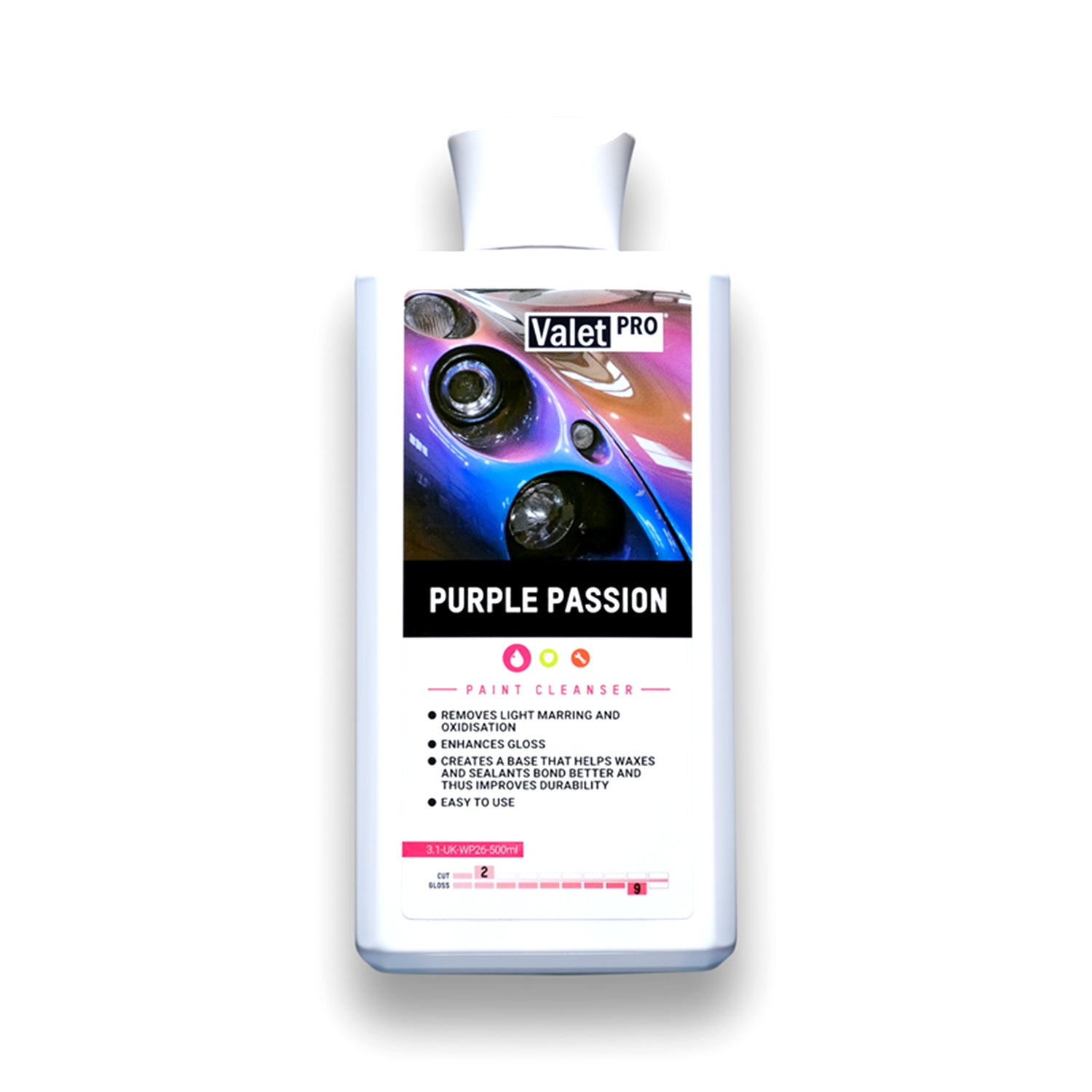 Valet-Pro Purple Passion is an easy-to-use paint cleanser that effortlessly removes fine marring from the paint surface while leaving a highly glossy, silky finish. This is the perfect pre-wax paint cleanser creating the perfect base for eitherMad Wax orBeading Marvellous.