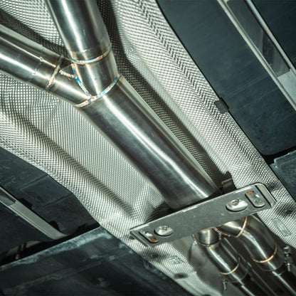 With the valves open, the system bypasses the mufflers for a raw, F1-like tone that brings out the S85’s high-revving character. When closed, the system delivers a more subtle, refined sound for comfortable cruising—making it ideal for dual-purpose street and spirited driving. Constructed from T304 stainless steel, this cat-back system replaces the factory rear section and mid-section, improving exhaust flow while reducing weight.